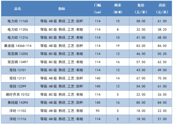 本周綢緞指數(shù)協(xié)作單位成交價格區(qū)間