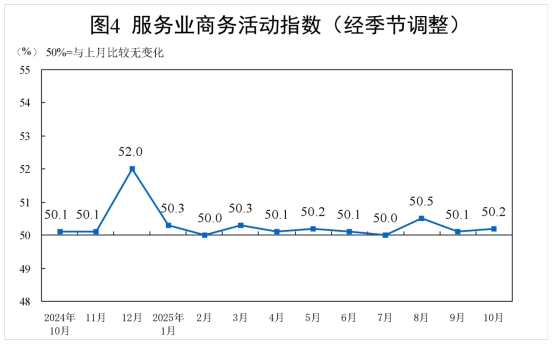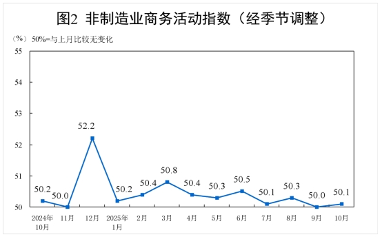 10月份,非制造業(yè)商務(wù)活動指數(shù)為50.1%,比上月上升0.1個百分點,升至擴張區(qū)間。