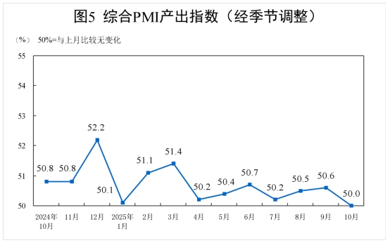 10月份,綜合PMI產(chǎn)出指數(shù)為50.0%,比上月下降0.6個百分點,位于臨界點,表明我國企業(yè)生產(chǎn)經(jīng)營活動總體穩(wěn)定。