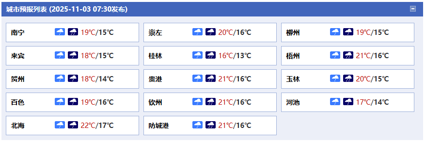 今天白天到晚上,各地氣溫:桂北11~18℃,桂南15~23℃。