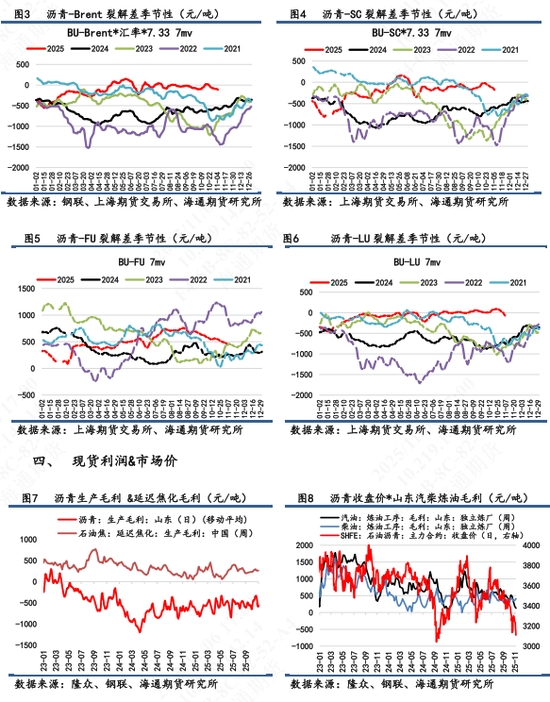 【3】裂解變化:①BU-Brent錄得-254元/噸,7天累計跌幅209元/噸,近4美元/桶,裂解差走弱跡象明顯。主要由于BU跌得比油價更多。當(dāng)日BU主力跌幅1.8%;Brent漲幅1.3%(以下午3點收盤成交價計算)。②當(dāng)日BU-SC/BU-LU/BU-FU回跌,BU-FU跌幅最多。