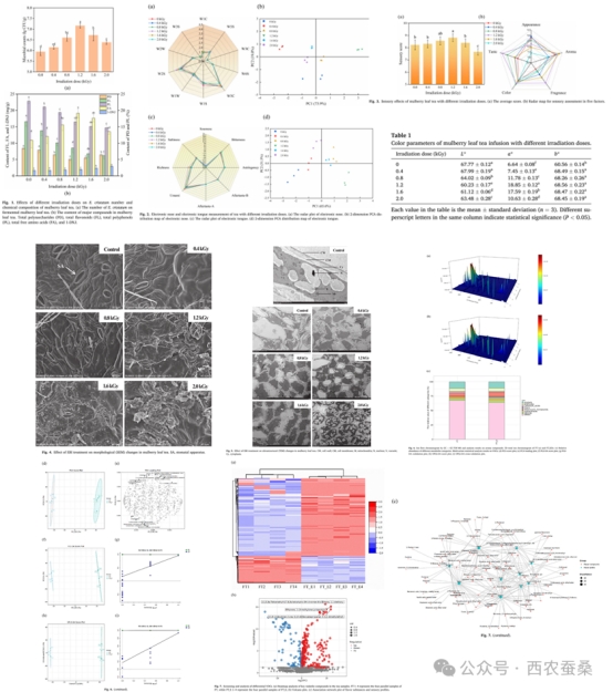 團(tuán)隊創(chuàng)新性采用電子束輻照這一非熱加工技術(shù)進(jìn)行預(yù)處理,系統(tǒng)探究了不同輻照劑量(0~2.0 kGy)對冠突散囊菌發(fā)酵的桑葉茶理化成分和感官品質(zhì)的影響。利用色度計、電子鼻、電子舌和感官評價系統(tǒng)分析了不同輻照劑量下茶湯的口感、顏色和香氣的差異。用掃描電子顯微鏡和透射電子顯微鏡觀察了不同輻照劑量下桑葉組織和細(xì)胞結(jié)構(gòu)的變化。同時,采用GC×GC-TOF-MS聯(lián)用技術(shù)研究了EBI對桑葉茶風(fēng)味成分的影響。研究發(fā)現(xiàn),1.2 kGy劑量的輻照處理可使冠突散囊菌數(shù)量顯著增加。同時,適度輻照能破壞桑葉細(xì)胞壁結(jié)構(gòu),促進(jìn)營養(yǎng)物質(zhì)釋放,為微生物代謝提供充足底物,從而優(yōu)化發(fā)酵過程。感官評定結(jié)果顯示,1.2 kGy電子束輻照改善了桑葉茯茶的色、香、味。香氣化合物分析發(fā)現(xiàn),輻照組中有277種化合物表達(dá)上調(diào),增強(qiáng)了甜味、水果味和蘑菇風(fēng)味,1-辛烯-3-醇是香氣的主要貢獻(xiàn)者。本研究為 EBI 技術(shù)在茶葉加工產(chǎn)業(yè)中的應(yīng)用提供了科學(xué)依據(jù)。