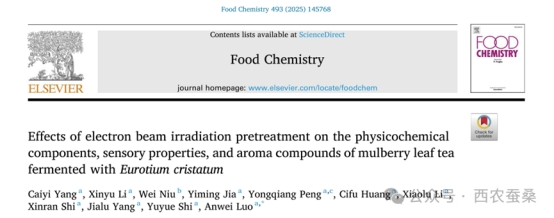 近日,陜西省蠶桑產(chǎn)業(yè)技術(shù)體系崗位專家、西北農(nóng)林科技大學(xué)食品科學(xué)與工程學(xué)院羅安偉教授團(tuán)隊研究成果《Effects of electron beam irradiation pretreatment on the physicochemical components, sensory properties, and aroma compounds of mulberry leaf tea fermented with Eurotium cristatum》在國際知名期刊《Food Chemistry》(IF=9.8)發(fā)表。該研究首次證實,1.2 kGy劑量的電子束輻照(EBI)預(yù)處理可顯著改善冠突散囊菌發(fā)酵桑葉茶(又稱金花桑葉茶、桑葉茯茶)的發(fā)酵品質(zhì)和風(fēng)味,有效解決市售桑葉茶常見的澀味重、香氣不足、營養(yǎng)物質(zhì)轉(zhuǎn)化不完全等問題,為桑葉茶加工及功能食品開發(fā)提供了全新技術(shù)路徑。
