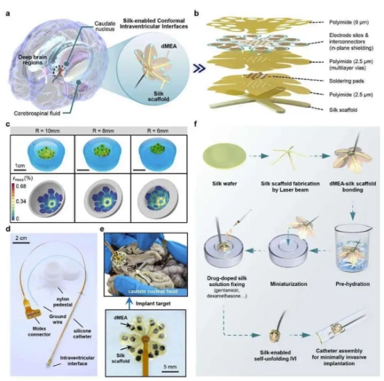 研究團(tuán)隊(duì)提出了形狀記憶絲蛋白支架結(jié)合可變形微電極陣列的神經(jīng)界面方案。該方案可微型化裝配于臨床常用規(guī)格微創(chuàng)手術(shù)導(dǎo)管,實(shí)現(xiàn)微創(chuàng)遞送,且進(jìn)入側(cè)腦室后,憑借絲蛋白支架的形狀記憶功能,可實(shí)現(xiàn)自展開(kāi)與適形貼附。