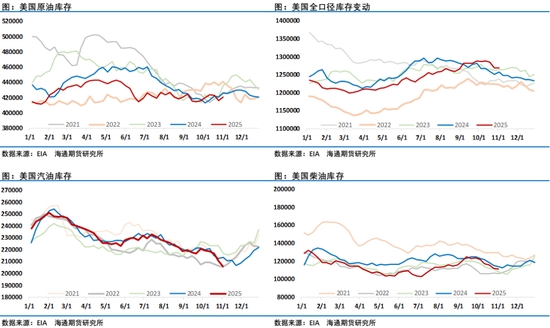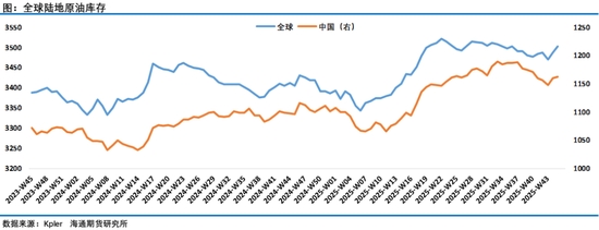 預(yù)測顯示,全球液態(tài)燃料消費(fèi)量在預(yù)測期內(nèi)每日將增加110萬桶。全球液態(tài)燃料消費(fèi)量的增長幾乎完全由非OECD國家驅(qū)動(dòng),這些國家在2025年每日增長120萬桶,在2026年每日增長100萬桶,而OECD國家的消費(fèi)量在2025年每日減少10萬桶,隨后在2026年每日增加10萬桶。非OECD國家的大部分增長集中在亞洲,其中相比2024年印度和中國的液態(tài)燃料消費(fèi)量到2026年每日將增加超過40萬桶。EIA強(qiáng)調(diào)對中國的需求預(yù)測僅包括最終消費(fèi),不包括庫存增加,過去幾個(gè)月來中國增加原油庫存的行為一直成為市場關(guān)注的一個(gè)熱點(diǎn),因缺乏官方數(shù)據(jù),各機(jī)構(gòu)通過追蹤的數(shù)據(jù)發(fā)現(xiàn)中國原油庫存持續(xù)增長,在三季度有所回落之后,10月底開始中國原油庫存再次回升,根據(jù)Kpler的高頻數(shù)據(jù)過去二周時(shí)間全球原油陸地庫存增加了3000萬桶,其中中國增加了1400萬桶。而目前水上原油仍維持在近年來高位,這部分水上庫存一旦成為顯性的陸地庫存預(yù)計(jì)將繼續(xù)給油價(jià)帶來壓力,目前來看市場對此也是高度警惕。考慮到對俄制裁及一些地緣因素給油價(jià)帶來的不確定性,最終供應(yīng)過剩壓力程度如何計(jì)價(jià)是需要接下來一段時(shí)間持續(xù)跟蹤的,這也是近期油價(jià)走勢猶豫的一個(gè)因素。