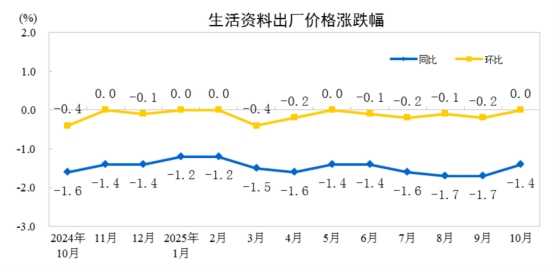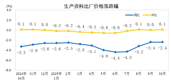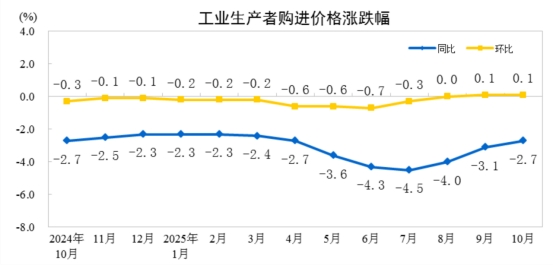 2025年10月份,全國(guó)工業(yè)生產(chǎn)者出廠價(jià)格同比下降2.1%,降幅比上月收窄0.2個(gè)百分點(diǎn);環(huán)比由上月持平轉(zhuǎn)為上漲0.1%。工業(yè)生產(chǎn)者購(gòu)進(jìn)價(jià)格同比下降2.7%,降幅比上月收窄0.4個(gè)百分點(diǎn);環(huán)比上漲0.1%,漲幅與上月相同。1—10月平均,工業(yè)生產(chǎn)者出廠價(jià)格比上年同期下降2.7%,工業(yè)生產(chǎn)者購(gòu)進(jìn)價(jià)格下降3.2%。