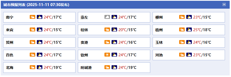 南寧市:今天白天到晚上,多云,偏北風(fēng)1~2級,最高氣溫24℃,最低氣溫18℃。