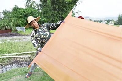 10月15日,在陽春市合水鎮(zhèn)的香云紗曬布場,100多名工人正在忙碌著,草地上鋪滿了正在制作香云紗的絲綢布匹。因浸泡時(shí)間不同,絲綢布匹的顏色都不同。一塊制作香云紗的布匹長約15米、寬1米。只見工人把浸泡過的絲綢布匹,一頭穿進(jìn)鐵管,鐵管兩頭露出的部位,剛好用地面的鐵釘固定,另一頭穿進(jìn)鐵管,曬布工人用手抓住鐵管露出的部位,再拉直布匹,布匹需要左右抖動(dòng)勻稱,平整地放在草地上。