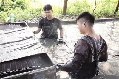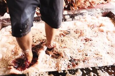 曬布工冼祖雙,是合水鎮(zhèn)人,到曬布場上班有一年多了。他說,曬香云紗一天有三四百塊錢的收入。曬布場離家近,照顧家庭也方便。曬布工成攀龍來自云浮,2007年開始從事香云紗曬莨,2022年來到合水鎮(zhèn)上班,主要負(fù)責(zé)浸染香云紗工作,每天從早上六點(diǎn)到下午三點(diǎn)浸染布匹十幾批次,一天要在水池中腳踩幾萬下。