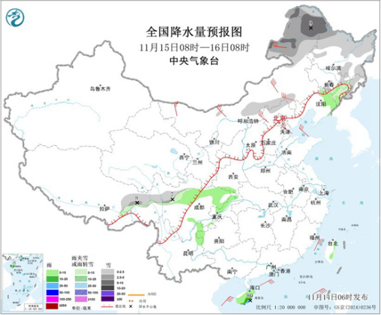 后天,內(nèi)蒙古東部、東北地區(qū)東部和北部、西藏東北部、西北地區(qū)東南部、川西高原北部等地部分地區(qū)有小到中雪或雨夾雪,其中,秦嶺高海拔地區(qū)等地局地有大到暴雪。西北地區(qū)東南部、西南地區(qū)東部、江漢大部、黃淮西部、海南島、臺灣島東部等地部分地區(qū)有小到中雨,其中,陜西南部、四川盆地東北部、重慶東北部等地部分地區(qū)有大雨。
