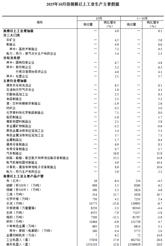 10月份,規(guī)模以上工業(yè)增加值同比實際增長4.9%(增加值增速均為扣除價格因素的實際增長率)。從環(huán)比看,10月份,規(guī)模以上工業(yè)增加值比上月增長0.17%。1—10月份,規(guī)模以上工業(yè)增加值同比增長6.1%。