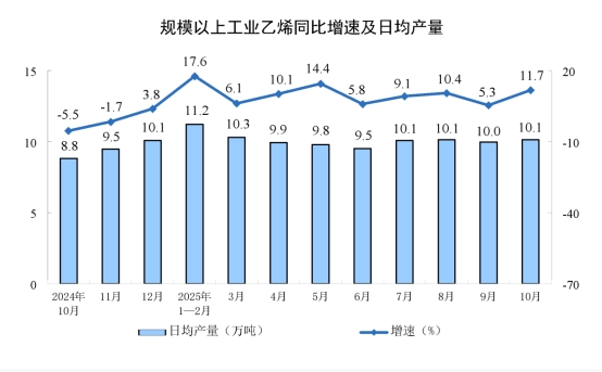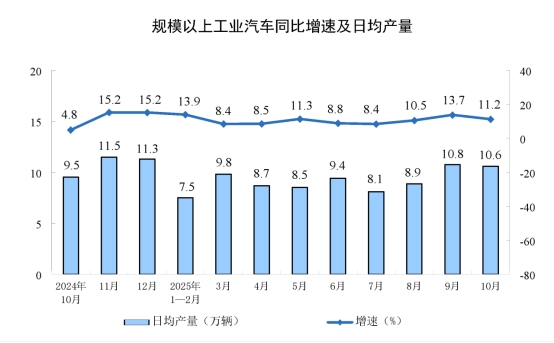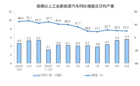 分產(chǎn)品看,10月份,規(guī)模以上工業(yè)623種產(chǎn)品中有313種產(chǎn)品產(chǎn)量同比增長。其中,鋼材11864萬噸,同比下降0.9%;水泥14775萬噸,下降15.8%;十種有色金屬695萬噸,增長2.9%;乙烯314萬噸,增長11.7%;汽車327.9萬輛,增長11.2%,其中新能源汽車171.0萬輛,增長19.3%;發(fā)電量8002億千瓦時,增長7.9%;原油加工量6343萬噸,增長6.4%。