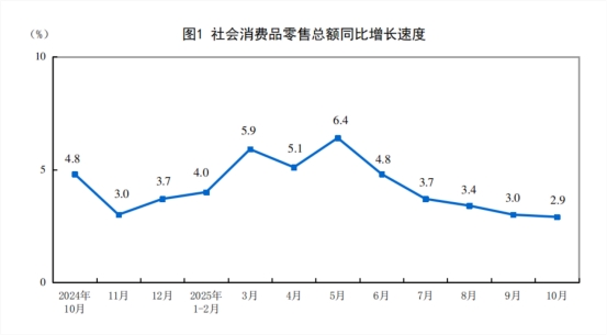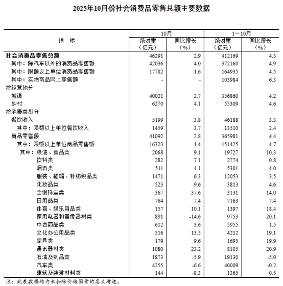 10月份,社會(huì)消費(fèi)品零售總額46291億元,同比增長(zhǎng)2.9%。其中,除汽車以外的消費(fèi)品零售額42036億元,增長(zhǎng)4.0%。1—10月份,社會(huì)消費(fèi)品零售總額412169億元,增長(zhǎng)4.3%。其中,除汽車以外的消費(fèi)品零售額372160億元,增長(zhǎng)4.9%。