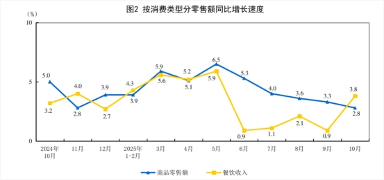 按消費(fèi)類型分,10月份,商品零售額41092億元,同比增長(zhǎng)2.8%;餐飲收入5199億元,增長(zhǎng)3.8%。1—10月份,商品零售額365981億元,增長(zhǎng)4.4%;餐飲收入46188億元,增長(zhǎng)3.3%。