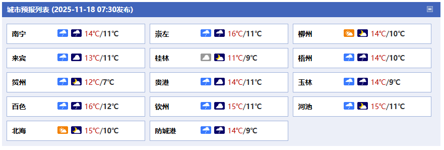 南寧市:今天白天到晚上,陰天有小雨,東北風(fēng)3級(jí)、陣風(fēng)6~7級(jí),最高氣溫14℃,最低氣溫11℃。