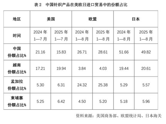 從主要出口市場(chǎng)來(lái)看,1—9月我國(guó)針織產(chǎn)品對(duì)美國(guó)出口147.25億美元,同比下降7.23%。受美國(guó)關(guān)稅政策擾動(dòng),訂單轉(zhuǎn)移趨勢(shì)加劇等影響,短期下行壓力顯著,其中9月當(dāng)月對(duì)美出口同比降幅擴(kuò)大至16.39%。另?yè)?jù)美國(guó)商務(wù)部數(shù)據(jù)顯示,今年1—7月我國(guó)針織產(chǎn)品在美國(guó)進(jìn)口貿(mào)易額中的占比為15.83%,較上年同期下降了5.33個(gè)百分點(diǎn);同期,越南、孟加拉國(guó)和柬埔寨的份額占比分別提高了2.73、1.01和1.17個(gè)百分點(diǎn),反映出美國(guó)市場(chǎng)訂單的變化走向。