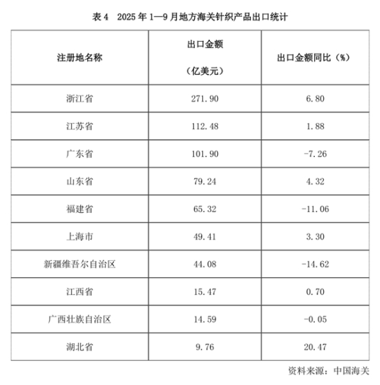 從地方海關(guān)數(shù)據(jù)來(lái)看,頭部出口地區(qū)表現(xiàn)不一。1—9月位列針織產(chǎn)品出口前五位的地區(qū)中,浙江、江蘇、山東情況較好,出口額同比分別增長(zhǎng)6.8%、1.88%和4.32%。廣東和福建同比分別下降7.26%和11.06%。