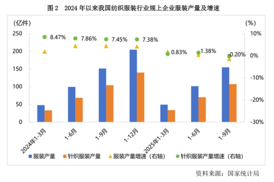 2025年1—9月,我國(guó)紡織服裝行業(yè)規(guī)模以上企業(yè)服裝產(chǎn)量同比下降1.47%;其中針織服裝產(chǎn)量同比下降0.20%,累計(jì)增速自8月份以來(lái)首次出現(xiàn)負(fù)增長(zhǎng),生產(chǎn)節(jié)奏有所放緩。針織服裝的產(chǎn)量占服裝總產(chǎn)量的比重為69.39%,處于歷史高位。針織服裝憑借產(chǎn)品創(chuàng)新與場(chǎng)景適配能力,在服裝總產(chǎn)量中保持高位占比,展現(xiàn)出較強(qiáng)的市場(chǎng)韌性。