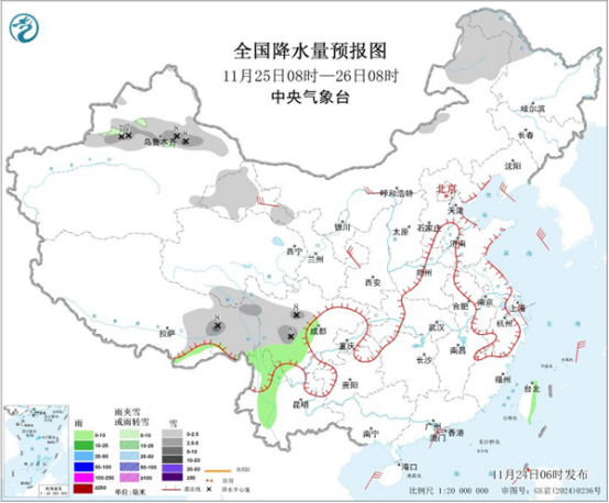 進(jìn)入11月下旬,影響我國的冷空氣較為頻繁。目前,一股較強(qiáng)冷空氣正自西向東影響我國,今明天(11月24日至25日),冷空氣繼續(xù)東移南下,東北、華北東部到華南等地都將出現(xiàn)降溫。緊接著,25日至27日,又將有新一股冷空氣影響我國。此外,我國西南地區(qū)、東北等地雨雪天氣頻繁,局地或現(xiàn)大雪。