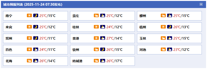 25日白天到晚上,晴間多云。最低氣溫:高寒山區(qū)-2~2℃,桂北2~10℃,桂南6~13℃。
