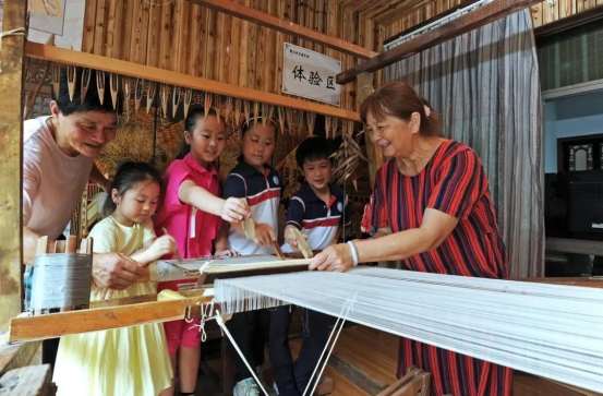 館長(zhǎng)王一士(左一)和妻子計(jì)金妹(右一)在輯里湖絲博物館向小朋友講述手工緙絲技藝