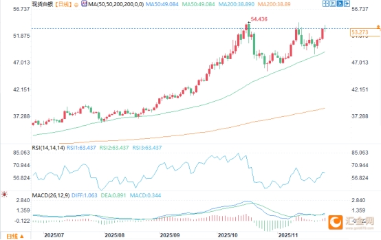 周四(11月27日)美盤時段,現(xiàn)貨白銀日內(nèi)價格呈現(xiàn)“先回落、后沖高再震蕩”的走勢:亞市早盤小幅下探后,亞盤尾盤左右快速拉升至日內(nèi)高點53.9附近,隨后逐步回落并在53.2-53.3區(qū)間進入橫盤震蕩。
