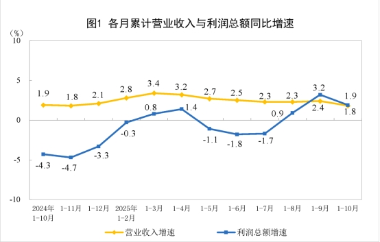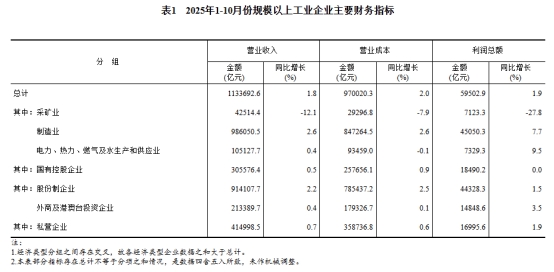 1—10月份,全國(guó)規(guī)模以上工業(yè)企業(yè)實(shí)現(xiàn)利潤(rùn)總額59502.9億元,同比增長(zhǎng)1.9%(按可比口徑計(jì)算,詳見附注二)。