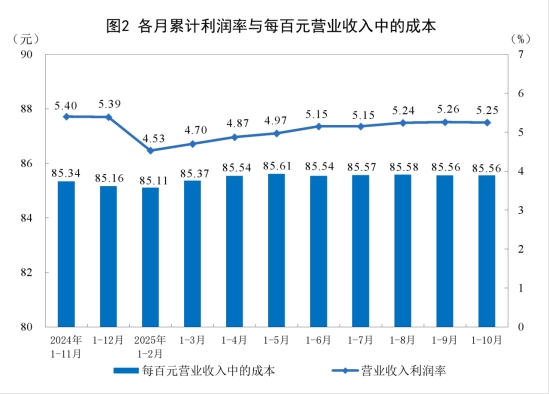 1—10月份,規(guī)模以上工業(yè)企業(yè)實(shí)現(xiàn)營(yíng)業(yè)收入113.37萬(wàn)億元,同比增長(zhǎng)1.8%;發(fā)生營(yíng)業(yè)成本97.00萬(wàn)億元,增長(zhǎng)2.0%;營(yíng)業(yè)收入利潤(rùn)率為5.25%,同比提高0.01個(gè)百分點(diǎn)。