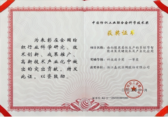 這是嘉欣絲綢首次獲得中國紡織行業(yè)的最高科技榮譽,這份沉甸甸的獎項,不僅是一份榮耀,更是對嘉欣絲綢在服裝生產(chǎn)數(shù)智化轉(zhuǎn)型道路上創(chuàng)新與實踐的國家級權(quán)威認可。