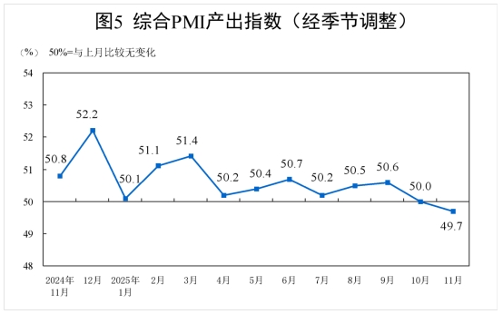 11月份,綜合PMI產(chǎn)出指數(shù)為49.7%,比上月下降0.3個(gè)百分點(diǎn)。