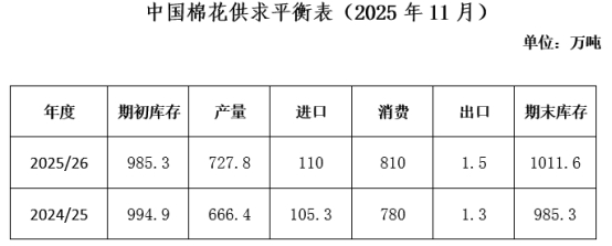 中國棉花協(xié)會預測:2025/26年度全國棉花產量727.8萬噸,同比增長9.2%;棉花進口量110萬噸,同比增長4.5%;消費量810萬噸,同比增長3.8%,期末庫存為1011.6萬噸,同比增長2.7%。