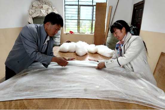 作為阿都鄉(xiāng)的手工蠶絲被老手藝人,他們每年4月份就著手養(yǎng)蠶,經(jīng)過45天的育苗、育蠶、結(jié)繭化蛹就可以采繭,再經(jīng)過煮繭、清洗、抽絲拉綿、晾曬,便可以進行蠶絲被的制作。