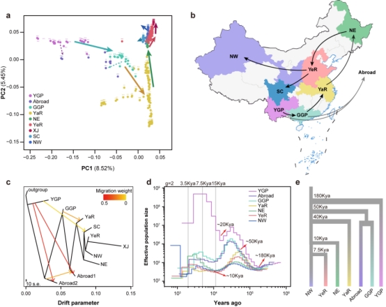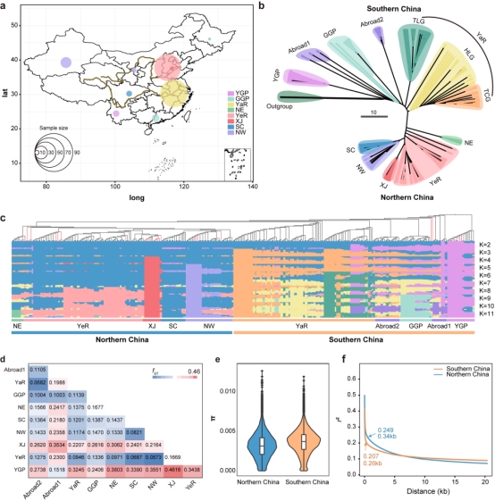 桑樹的起源在學(xué)界長(zhǎng)期存在爭(zhēng)議。為破解這一謎題,本研究對(duì)來自全球12個(gè)國(guó)家的376份桑樹種質(zhì)資源進(jìn)行了系統(tǒng)分析,其中包括39株具有數(shù)百乃至上千年樹齡的珍貴古桑樹。研究結(jié)果系統(tǒng)解析了桑樹起源、擴(kuò)散軌跡及南北群體遺傳分化規(guī)律,通過分子證據(jù)明確了云貴高原為桑樹起源中心。研究進(jìn)一步揭示,桑樹從起源地出發(fā),主要沿著"由南向北"的路線在中國(guó)境內(nèi)擴(kuò)散,這一遷徙過程導(dǎo)致了顯著的南北種群遺傳分化。值得關(guān)注的是,南方種群表現(xiàn)出更高的遺傳多樣性,這一發(fā)現(xiàn)為云貴高原作為桑樹起源中心提供了有力佐證(圖2、圖3)。