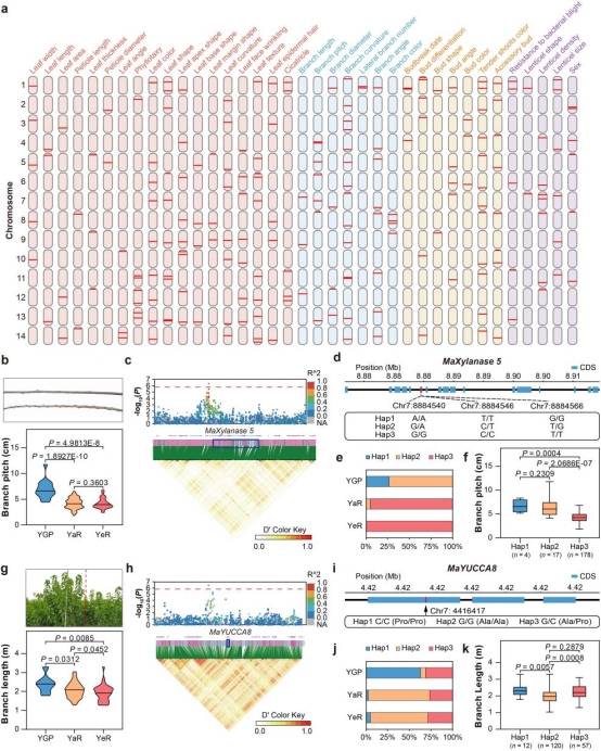 目前,桑樹性狀的遺傳解析多局限于少數(shù)類型,缺乏大規(guī)模系統(tǒng)性研究,嚴(yán)重制約了桑樹分子育種的進(jìn)程。為突破這一瓶頸,研究團(tuán)隊(duì)系統(tǒng)調(diào)查了37個(gè)與桑樹生長(zhǎng)發(fā)育及抗性相關(guān)的重要農(nóng)藝性狀,通過GWAS分析鑒定到了204個(gè)關(guān)鍵位點(diǎn),并對(duì)莖節(jié)長(zhǎng)度、株高、發(fā)芽時(shí)間、葉片大小、葉片厚度等關(guān)鍵生產(chǎn)性狀進(jìn)行單倍型解析,精準(zhǔn)鑒定調(diào)控性狀的相關(guān)基因,為桑樹分子設(shè)計(jì)育種奠定堅(jiān)實(shí)基礎(chǔ)。