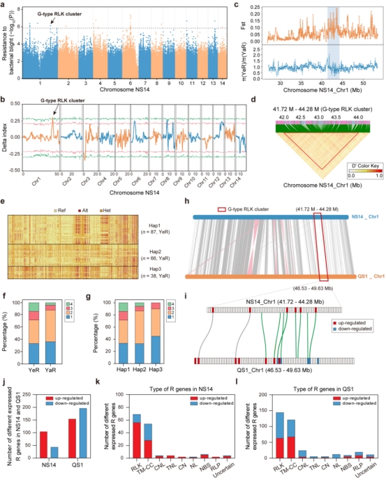 桑疫病是近年來危害桑產(chǎn)業(yè)的主要細(xì)菌性病害,對(duì)產(chǎn)業(yè)造成了極大經(jīng)濟(jì)損失。為解析桑樹的桑疫病抗性機(jī)制,團(tuán)隊(duì)歷時(shí)五年構(gòu)建了強(qiáng)抗病品種‘農(nóng)桑14號(hào)’與易感病品種‘強(qiáng)桑1號(hào)’的子代分離群體,對(duì)子代538個(gè)群體進(jìn)行連續(xù)3年的抗病性調(diào)查,通過BSA+GWAS策略,首次發(fā)現(xiàn)位于1號(hào)染色體的G-type RLK串聯(lián)超級(jí)基因簇在桑樹疫病抗性中的關(guān)鍵作用,揭示了桑樹抗病性的核心遺傳基礎(chǔ),為桑樹抗病分子育種提供了關(guān)鍵靶點(diǎn)與理論依據(jù)(圖5)。
