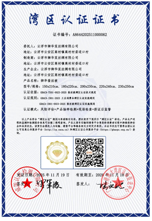 近日,云浮市御華繭絲綢有限公司的“御華蠶絲被”獲得灣區(qū)認證證書,這是全國蠶絲被行業(yè)首張灣區(qū)認證證書,標志著云浮特色蠶絲制品成功對接大灣區(qū)高端市場,成為云浮打造“南江蠶桑”品牌的重要節(jié)點成果。