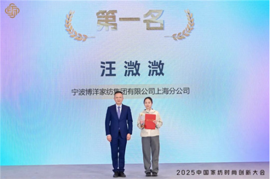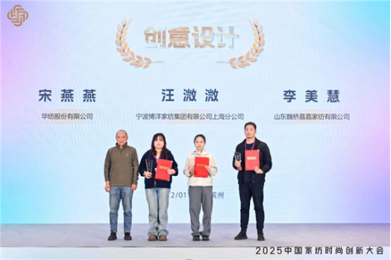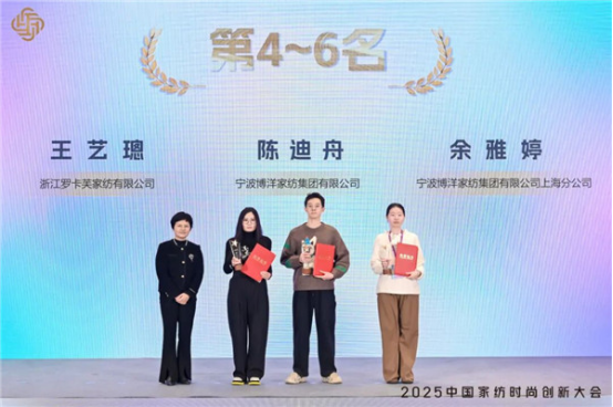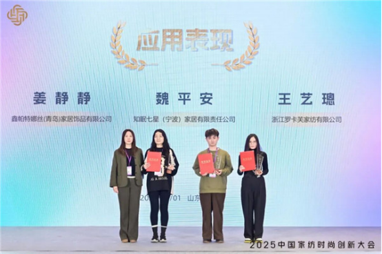 中國家用紡織品行業(yè)協(xié)會副會長吳永茜為“應(yīng)用表現(xiàn)”單項(xiàng)獎(jiǎng)第一名知眠七星(寧波)家居有限責(zé)任公司魏平安、第二名浙江羅卡芙家紡有限公司王藝璁、第三名鑫帕特娜絲(青島)家居飾品有限公司姜靜靜頒獎(jiǎng)。