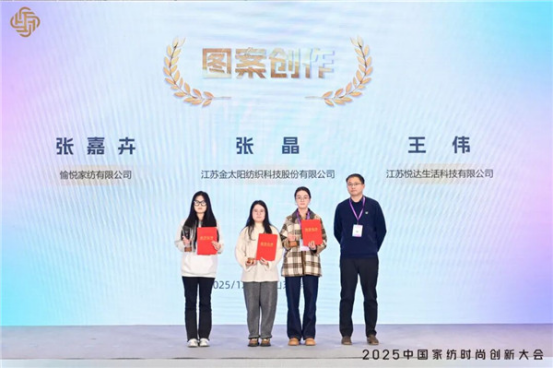 中國財(cái)貿(mào)輕紡煙草工會紡織工作部副部長周晨為“圖案創(chuàng)作”單項(xiàng)獎(jiǎng)第一名江蘇金太陽紡織科技股份有限公司張晶、第二名江蘇悅達(dá)生活科技有限公司王偉、第三名愉悅家紡有限公司張嘉卉頒獎(jiǎng)。