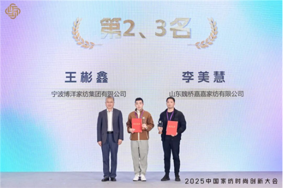 王雙清為全國決賽第二名寧波博洋家紡集團(tuán)有限公司王彬鑫、第三名山東魏橋嘉嘉家紡有限公司李美慧頒獎(jiǎng)。