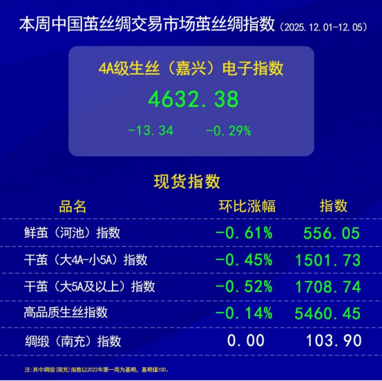 高品質(zhì)生絲價(jià)格指數(shù)延續(xù)小幅下調(diào),部分協(xié)作單位根據(jù)當(dāng)前行情適時(shí)調(diào)整報(bào)價(jià)。