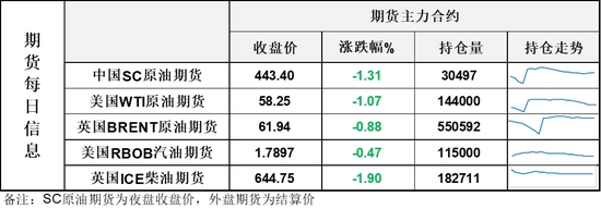 【1】WTI主力原油期貨收跌0.63美元,跌幅1.07%,報58.25美元/桶;布倫特主力原油期貨收跌0.55美元,跌幅0.88%,報61.94美元/桶;INE原油期貨收跌1.31%,報443.4元。
