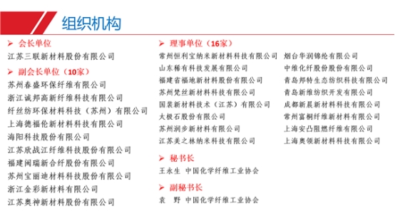 會上,中國化纖協(xié)會高性能和高功能纖維分會形成了新一屆組織機構。其中,江蘇三聯(lián)新材料股份有限公司擔任分會會長單位,蘇州春盛環(huán)保纖維有限公司等10家企業(yè)擔任副會長單位,中國化纖協(xié)會市場推廣部主任王永生擔任秘書長,中國化纖協(xié)會袁野擔任副秘書長。