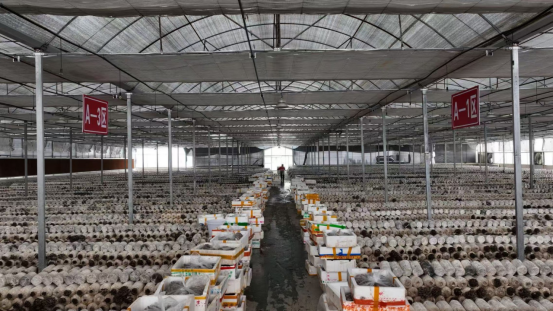 在猛山鄉(xiāng)萬(wàn)民村集體經(jīng)濟(jì)菌場(chǎng),23萬(wàn)袋菌棒整齊堆放。