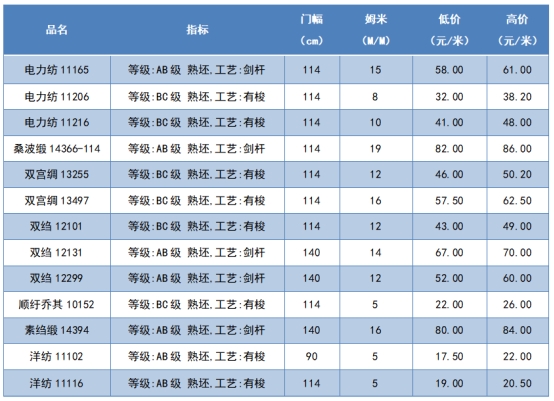 本周綢緞指數(shù)協(xié)作單位成交價格區(qū)間