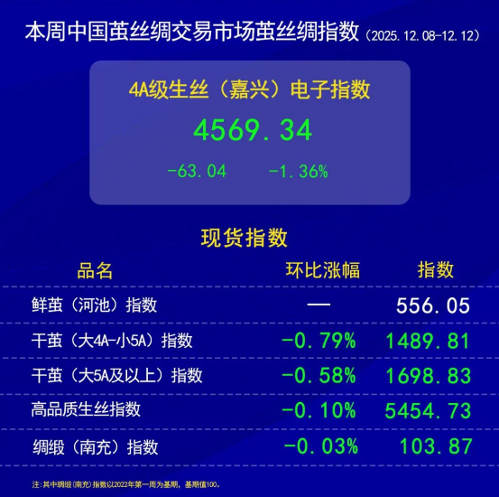 今日(周五)生絲盤面各遠近合約延續(xù)下跌態(tài)勢,本周5個交易日均收陰線,生絲電子指數(shù)累計下跌1.36%,報收于4569.34點,本周跌幅創(chuàng)下半年以來新高,直觀反映進入12月后,尤其是本周繭絲綢產業(yè)鏈的傳導格局
