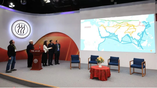李沁教授與主旨報告的三位專家及李啟正總編輯共同登臺,攜手啟動這份研究倡議。隨著五位嘉賓依次按下啟動按鈕,大屏幕上,五條分屬陸上與海上的絲綢之路光影脈絡依次被點亮,或橫貫大陸,或縱越滄海,古今交融的璀璨線條展開了一幅超越地理與文化的絲路文明長卷。