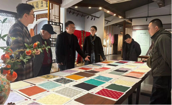 調(diào)研過程中,在省級(jí)非物質(zhì)文化遺產(chǎn)代表性傳承人、企業(yè)負(fù)責(zé)人朱立群及李笑蘇的陪同下,王柯院長一行深入企業(yè)技藝與產(chǎn)品展陳空間,系統(tǒng)考察蘇羅織物的織造流程、材料特性及其在現(xiàn)代設(shè)計(jì)中的轉(zhuǎn)化路徑。學(xué)院教師重點(diǎn)關(guān)注傳統(tǒng)工藝如何在當(dāng)代生活中被重新詮釋與應(yīng)用,并就技藝細(xì)節(jié)、紋樣文化內(nèi)涵與創(chuàng)新可能性進(jìn)行了現(xiàn)場交流與記錄。