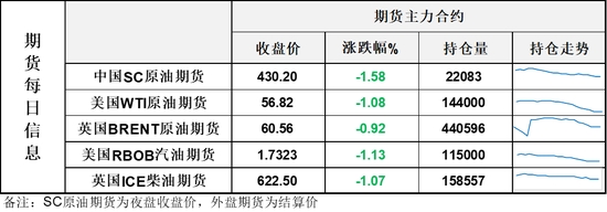 【1】WTI主力原油期貨收跌0.62美元,跌幅1.08%,報(bào)56.82美元/桶;布倫特主力原油期貨收跌0.56美元,跌幅0.92%,報(bào)60.56美元/桶;INE原油期貨收跌1.58%,報(bào)430.2元。