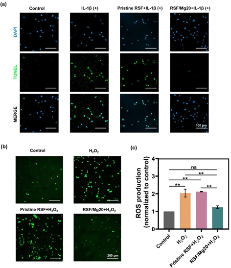 RSF/Mg20薄膜的具有抗炎特性,有助于減少炎癥導(dǎo)致的細(xì)胞凋亡。復(fù)合薄膜可以減輕受氧化應(yīng)激細(xì)胞中ROS過(guò)量產(chǎn)生,從而減少細(xì)胞損傷并增強(qiáng)愈合環(huán)境。