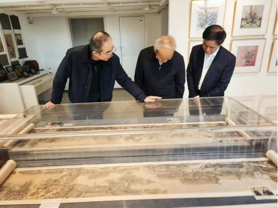 李加林向杜鈺洲系統(tǒng)介紹了現(xiàn)代織錦的創(chuàng)作理念與近期推出的系列新作。這些作品融合數(shù)碼織造技術(shù)與創(chuàng)新工藝,在題材表達與工藝精細度上均取得重要突破,展現(xiàn)出織錦藝術(shù)在當(dāng)代語境下的創(chuàng)新活力。杜鈺洲駐足細觀,對作品在色彩漸變層次與細節(jié)呈現(xiàn)等方面體現(xiàn)出的藝術(shù)表現(xiàn)力表示高度贊賞。